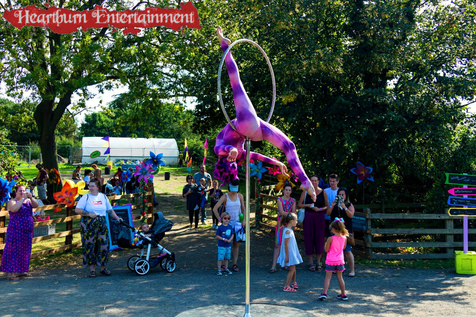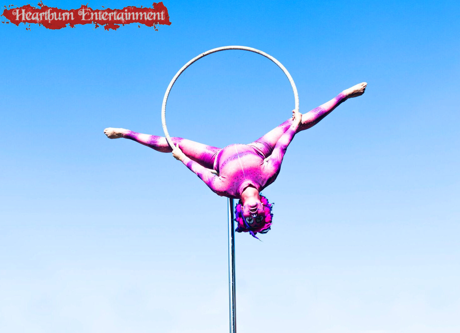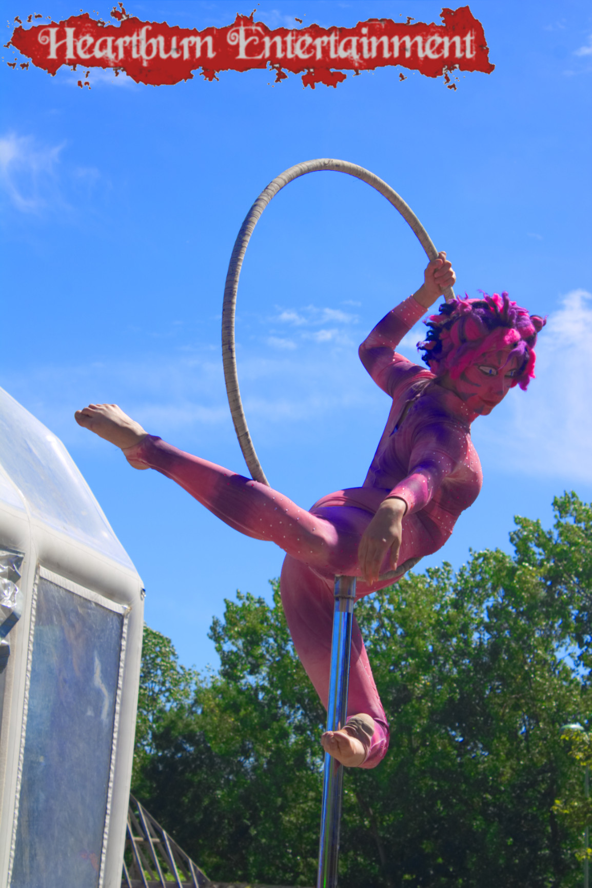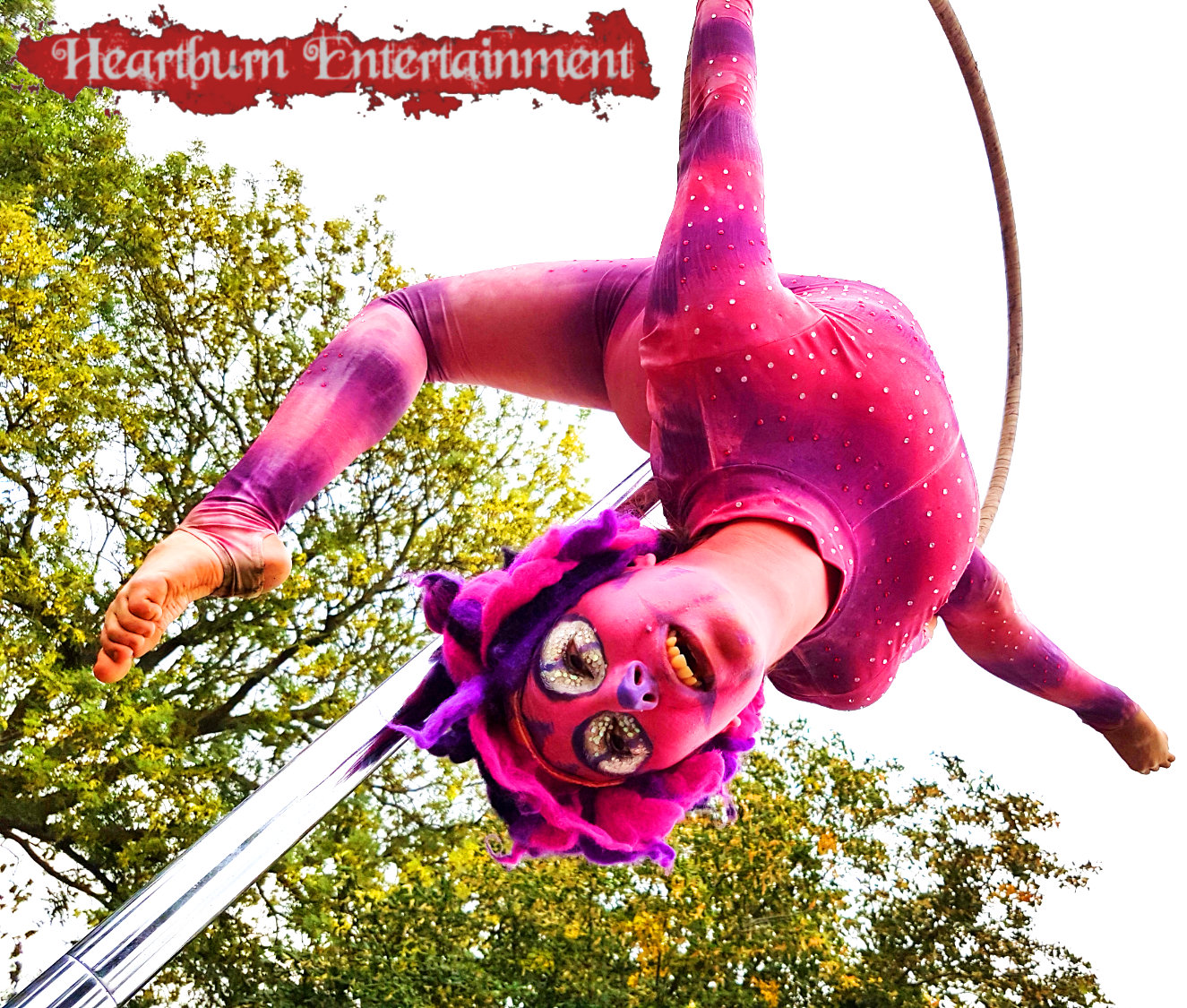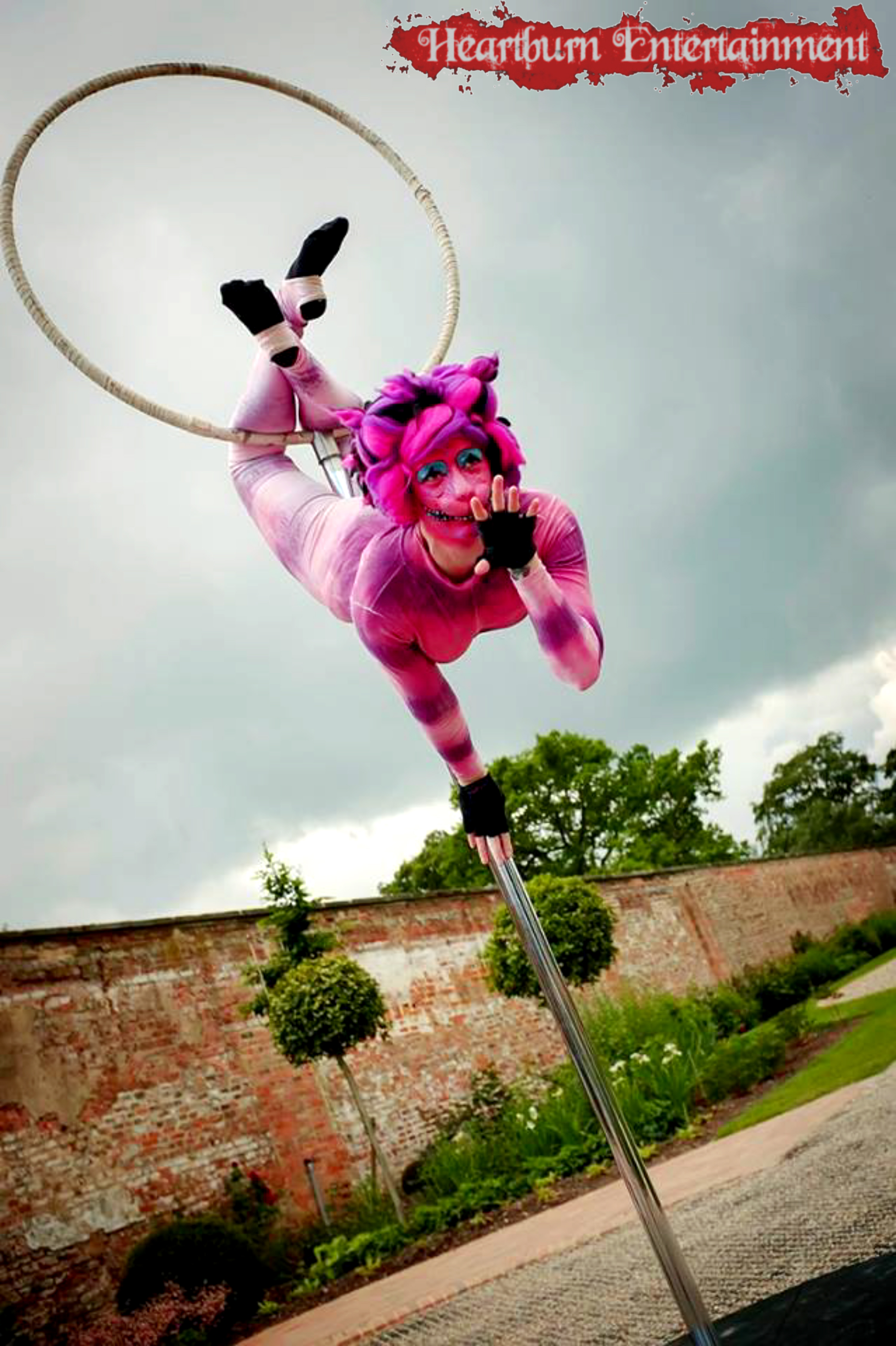Our talented Cheshire cat grins and spins on our free standing aerial hoop!