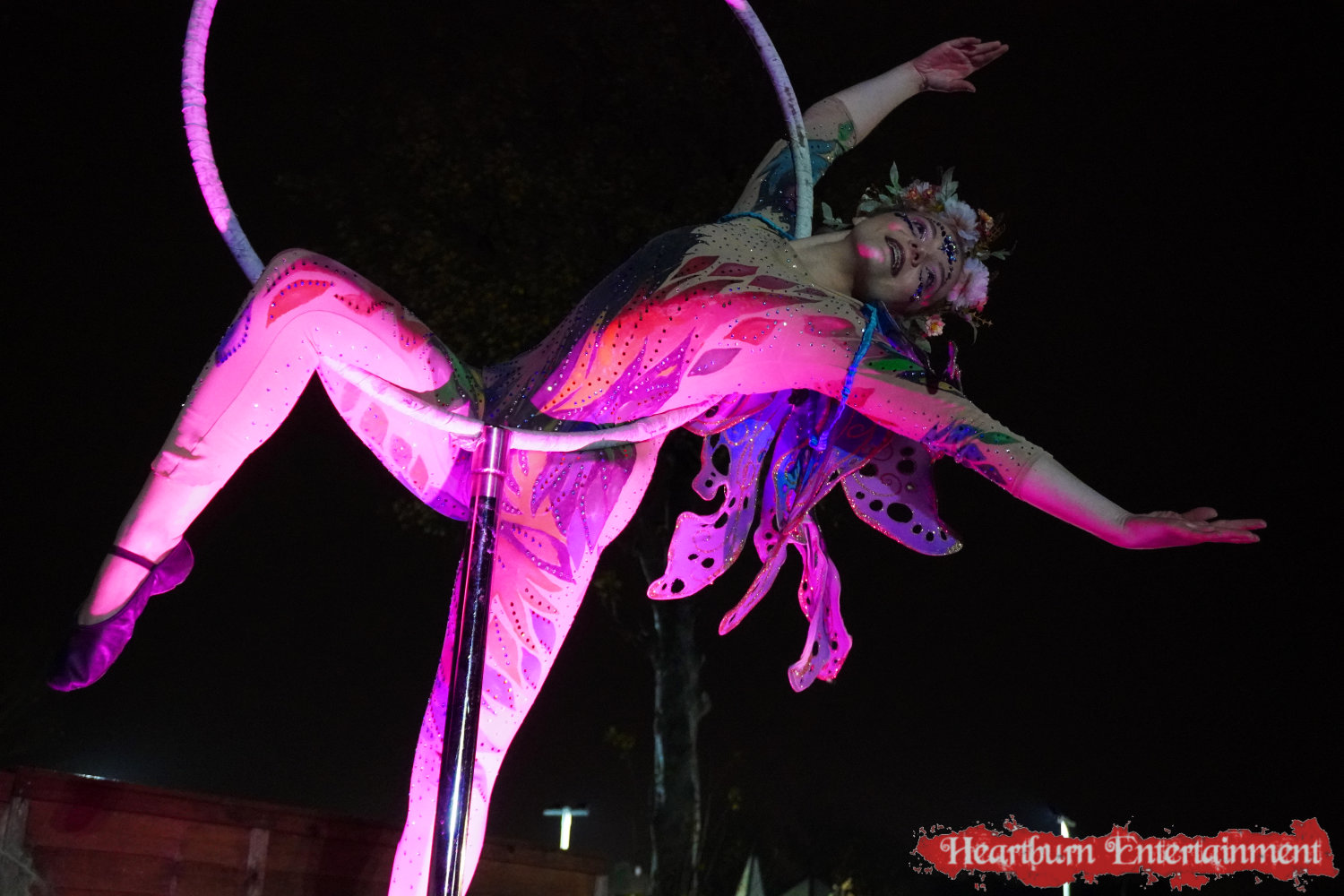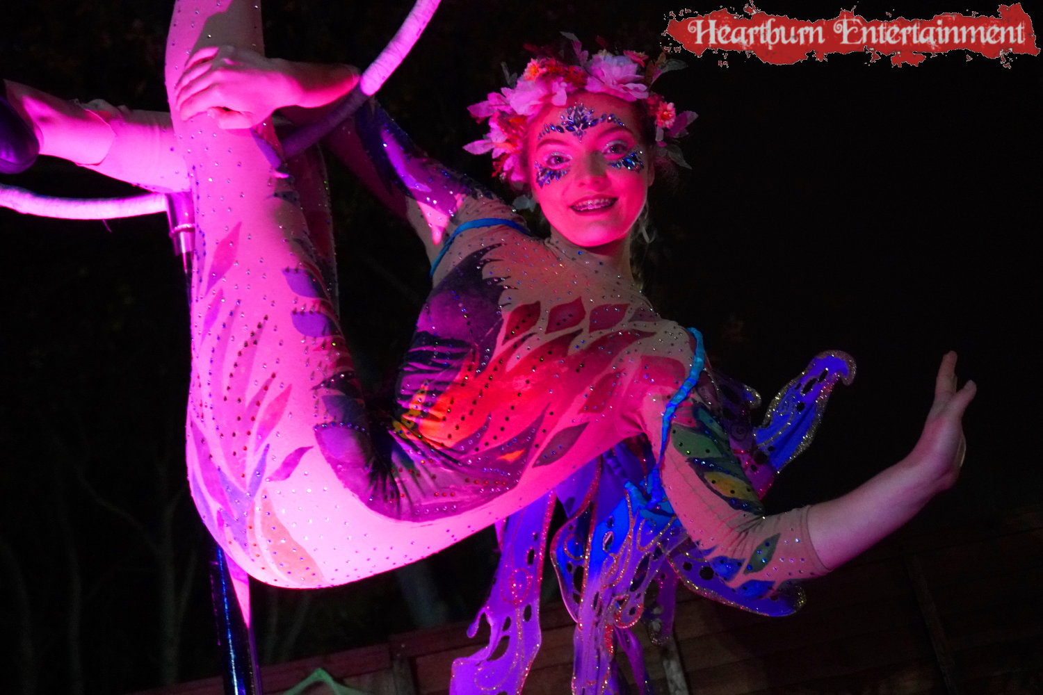 Our aerial fairy performers on our amazing free standing aerial rig which ban be placed anywhere. It does not require any rigging points making it much easier to use in listed venues as well as at outdoors events.