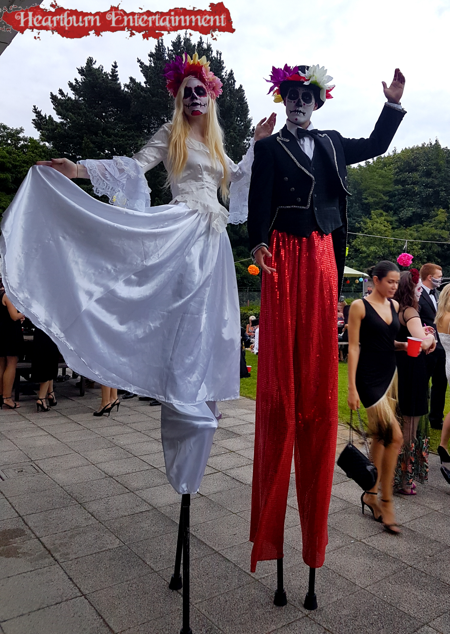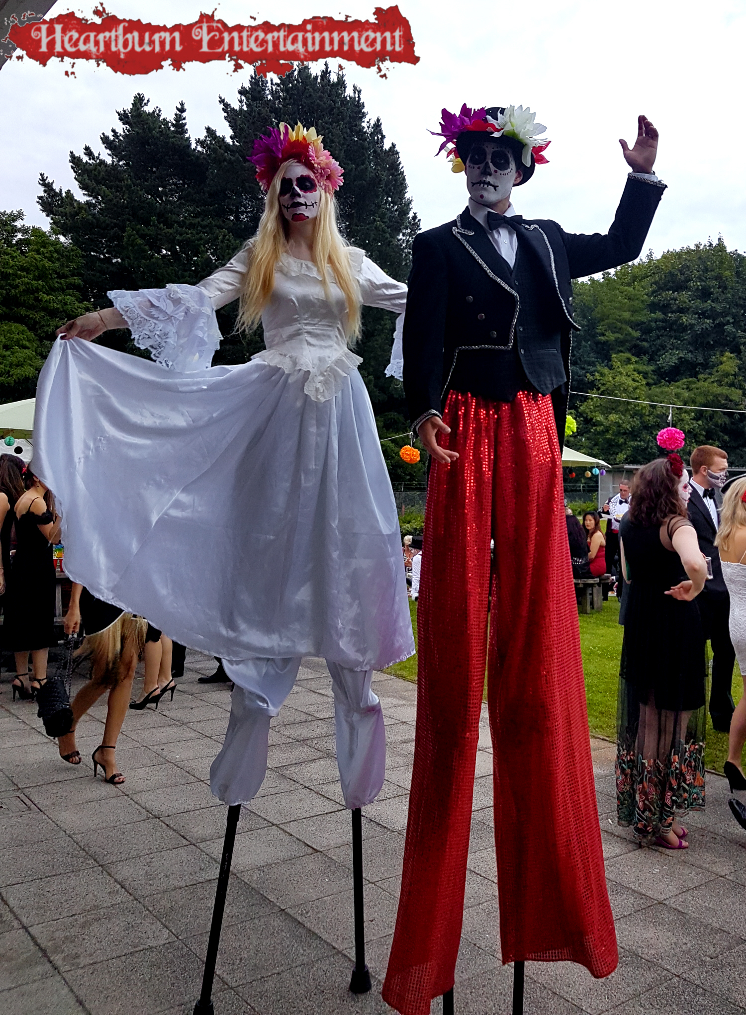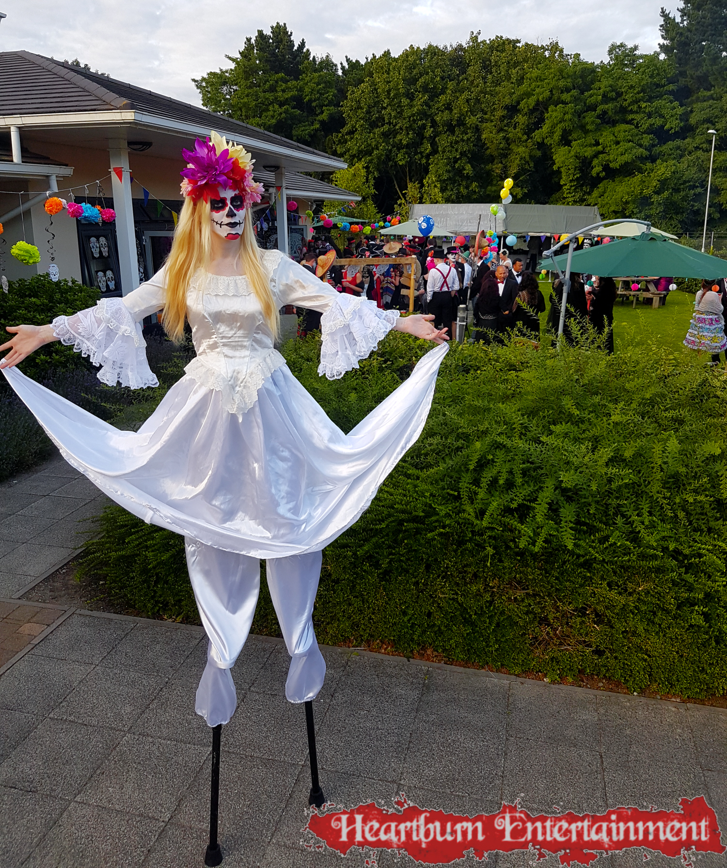 Our day of the dead stilt walkers are ideal interactive walkabout entertainment adorned in exciting face paint, excuisite costumes and floral headpieces.