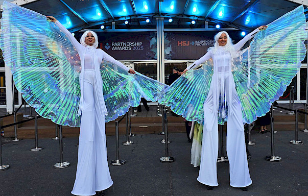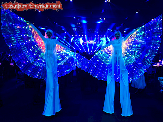 Their pure white elegant stilt costumes were offset with stunning irredescent LED wings to create a fantastic welcoming act for guests.
