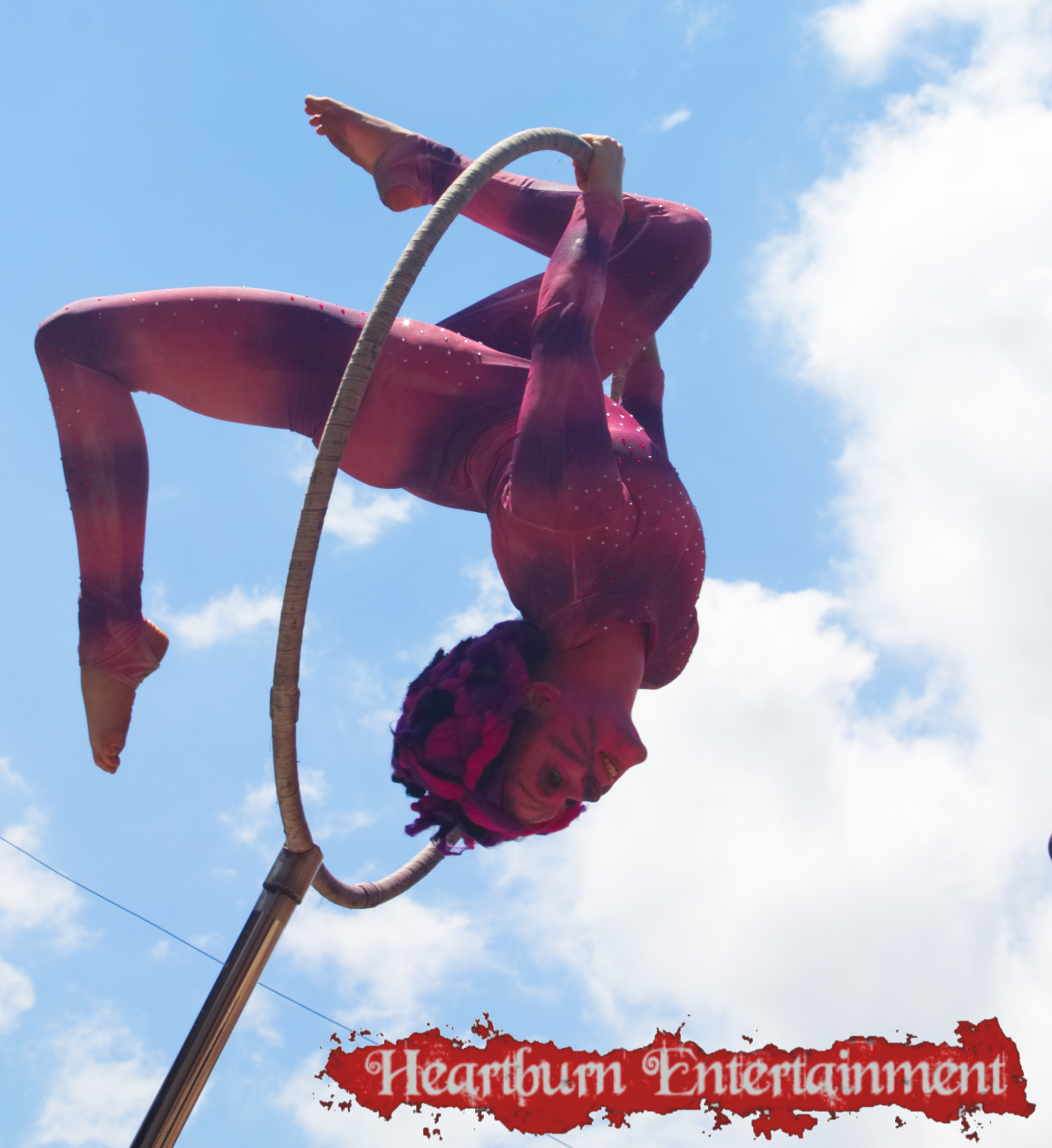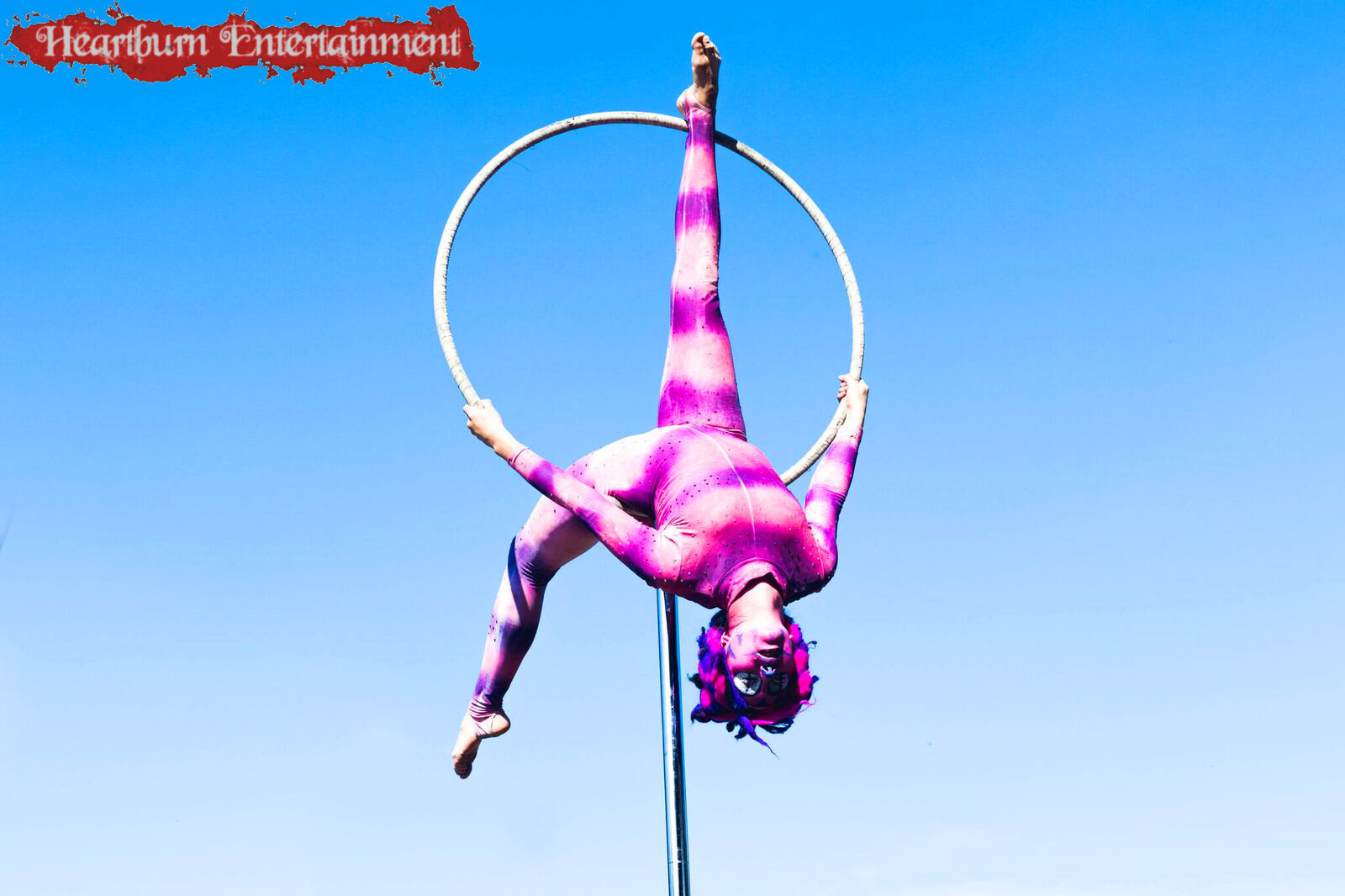 Our talented Cheshire cat grins and spins on our free standing aerial hoop!