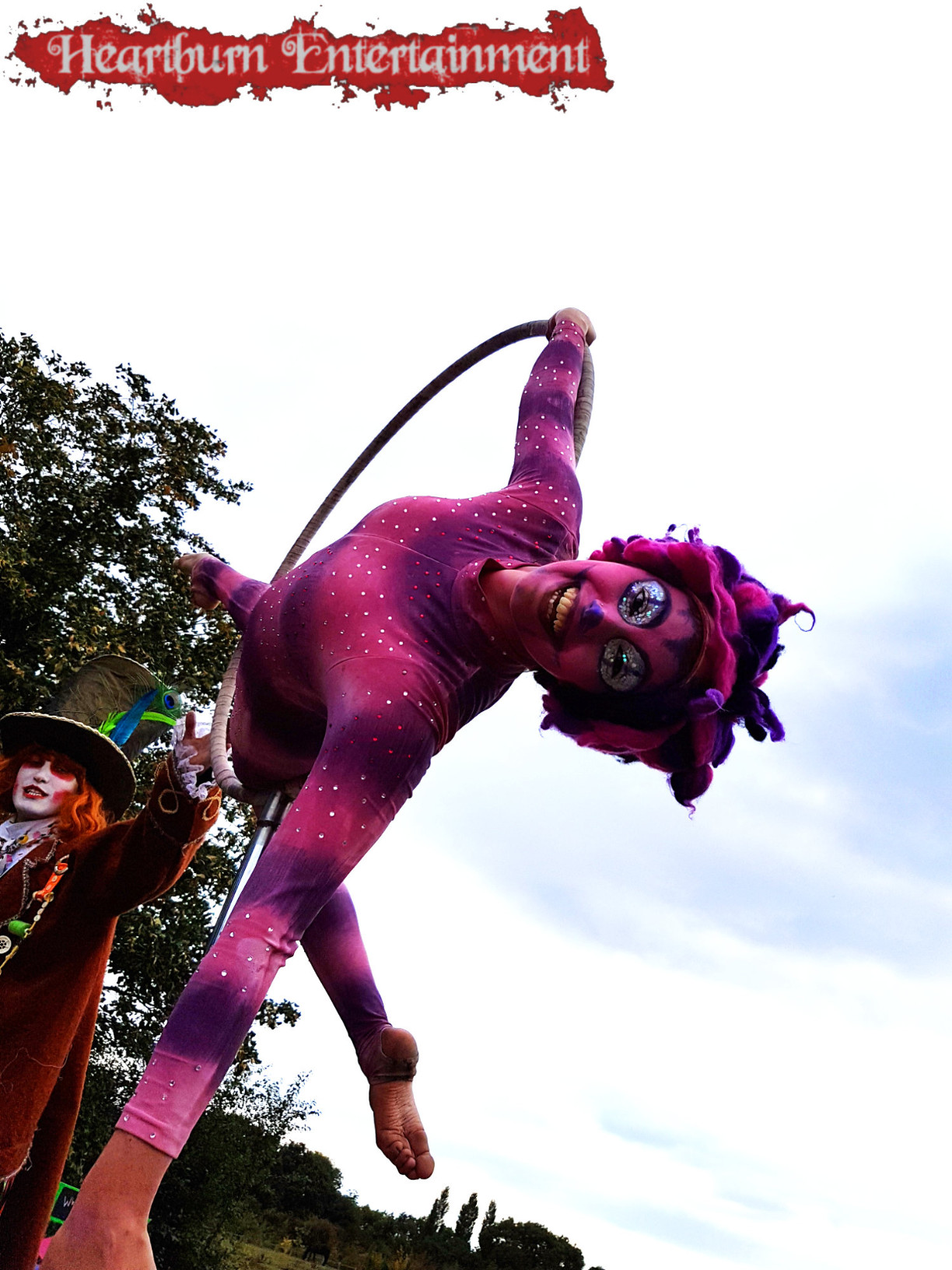 Swinging upside down, contorting around the hoop and twirling to create mesmerising shapes our Cheshire cat is a great addition to any Alice in Wonderland themed event!