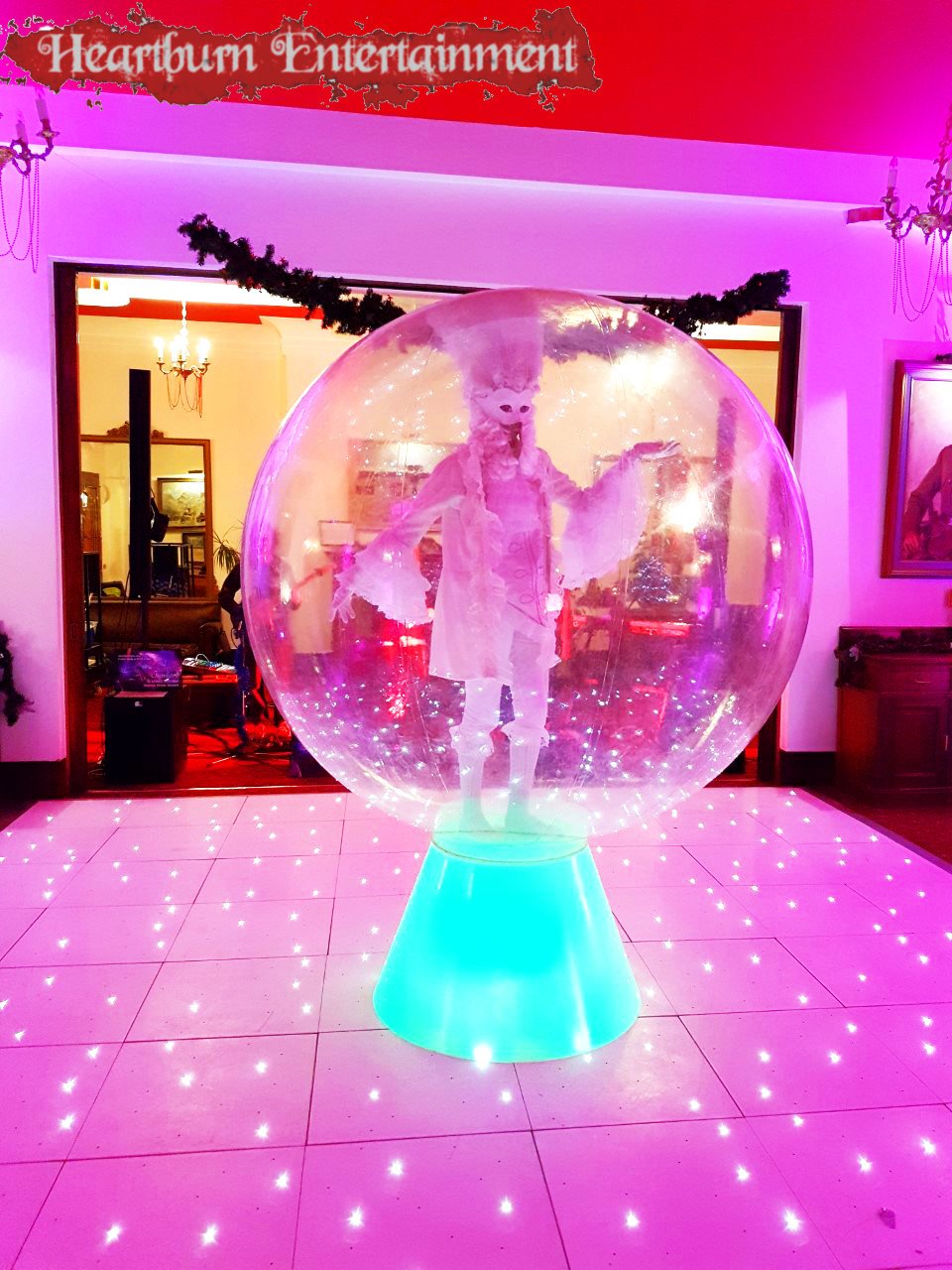 Our human snhow globe is pupular for Christmas parties and events, masquerade themed events, enchanted themed events and Winter wonderland themed events.