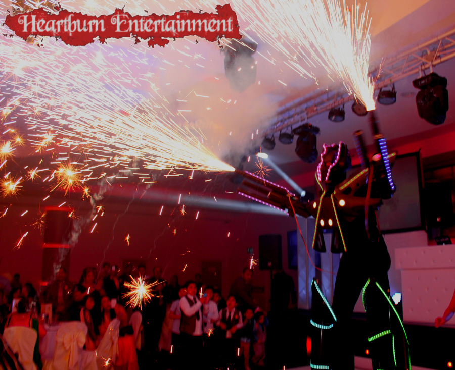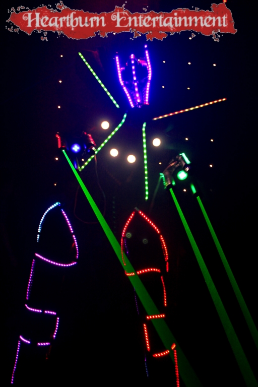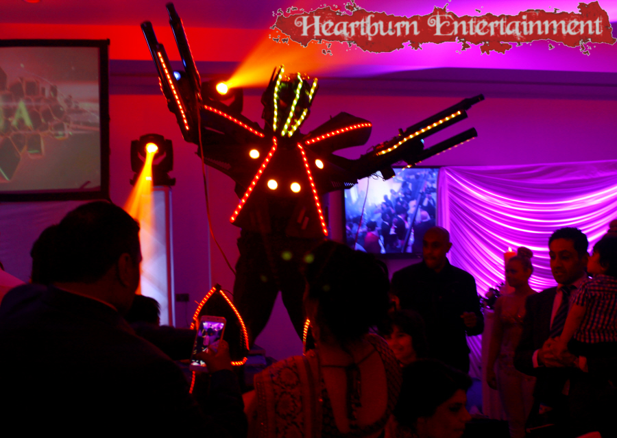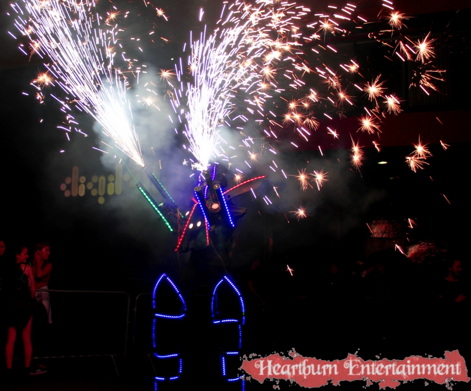 Pyrobot is often accompanied by our LED glow girl dancers or our multi skilled fire performers. He can even do shows with our real life Transformers Bumblebee and Optimus Prime.