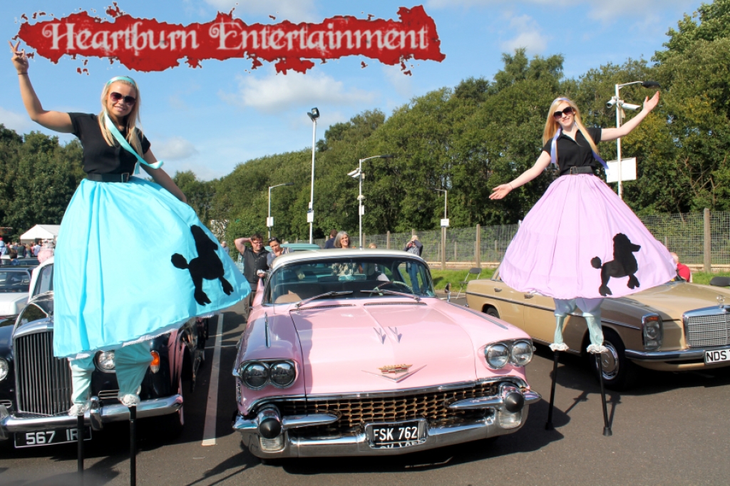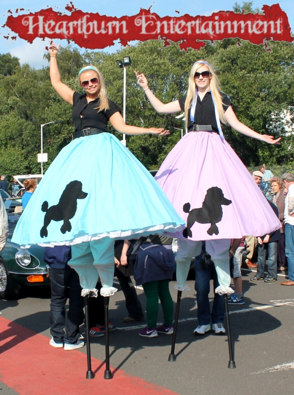 We have traditional black and white checked stilt walkers as well as 1950s vintage stilt walkers for vintage car shows.